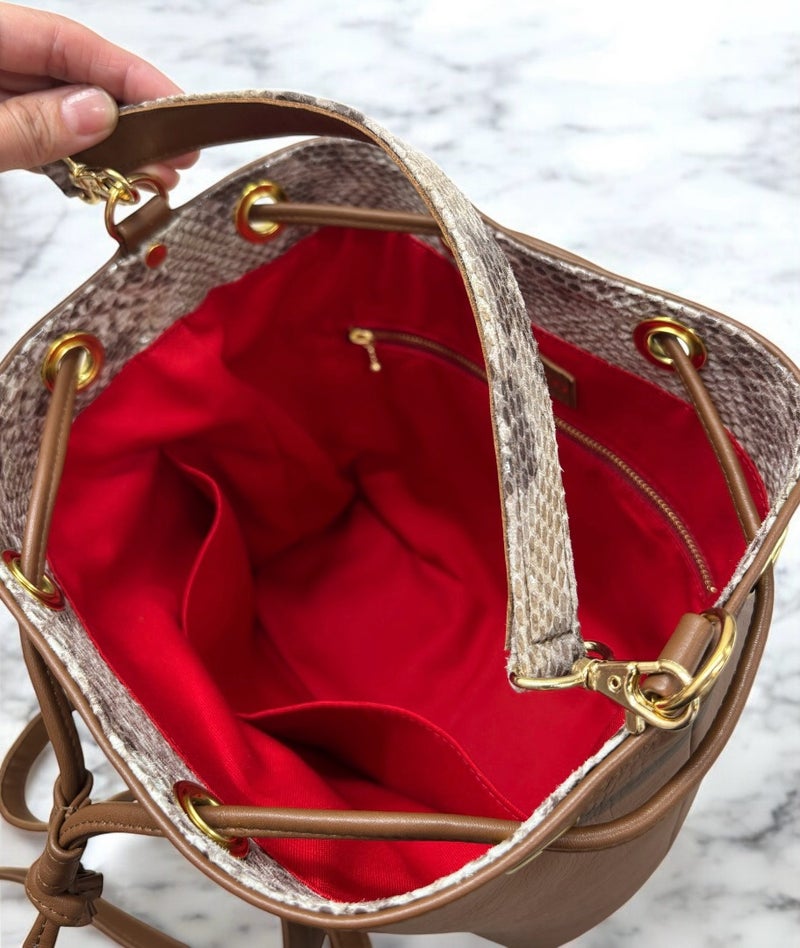 巾着バッグ カスタムオーダー商品 2025.11.23 定番商品 巾着バッグ オプション付カスタムオーダー¥18,700税込 底ビョウをオプションで追加されました。 本革ブラウンに見返しと底、持ち手の表革は豚革パイソンプリント。 裏地はレッド 私もプライベートバッグとして愛用しています。 長財布が縦に入るので、見た目以上に荷物が入ります! 斜めがけ、肩がけにもオシャレに持てるバッグです✨ ☆ ⬇️ご予約・お問い合わせはこちらから ※12時間以内に返信いたします。返信がない場合、お手数ですがもう一度ご連絡ください。
