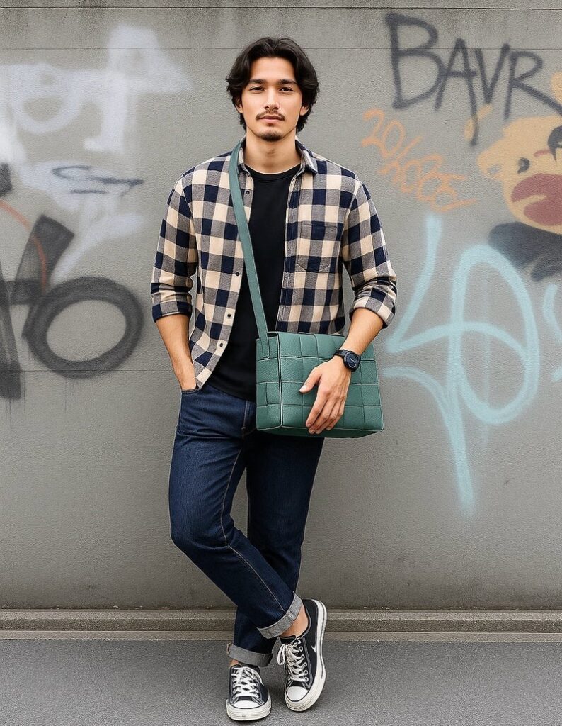 チェックシャツ×デニムのシンプルなカジュアルスタイル。