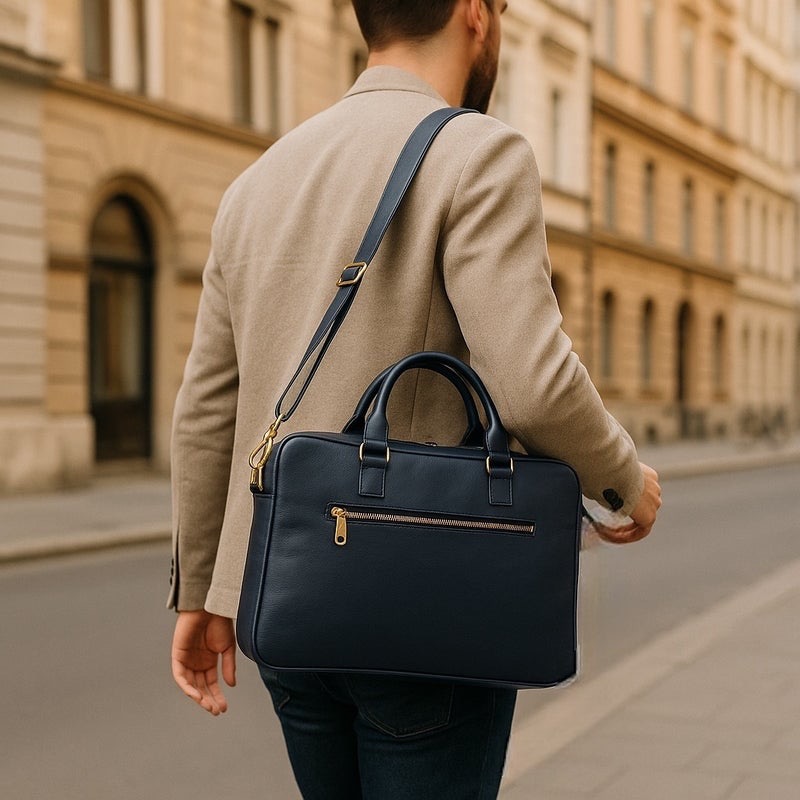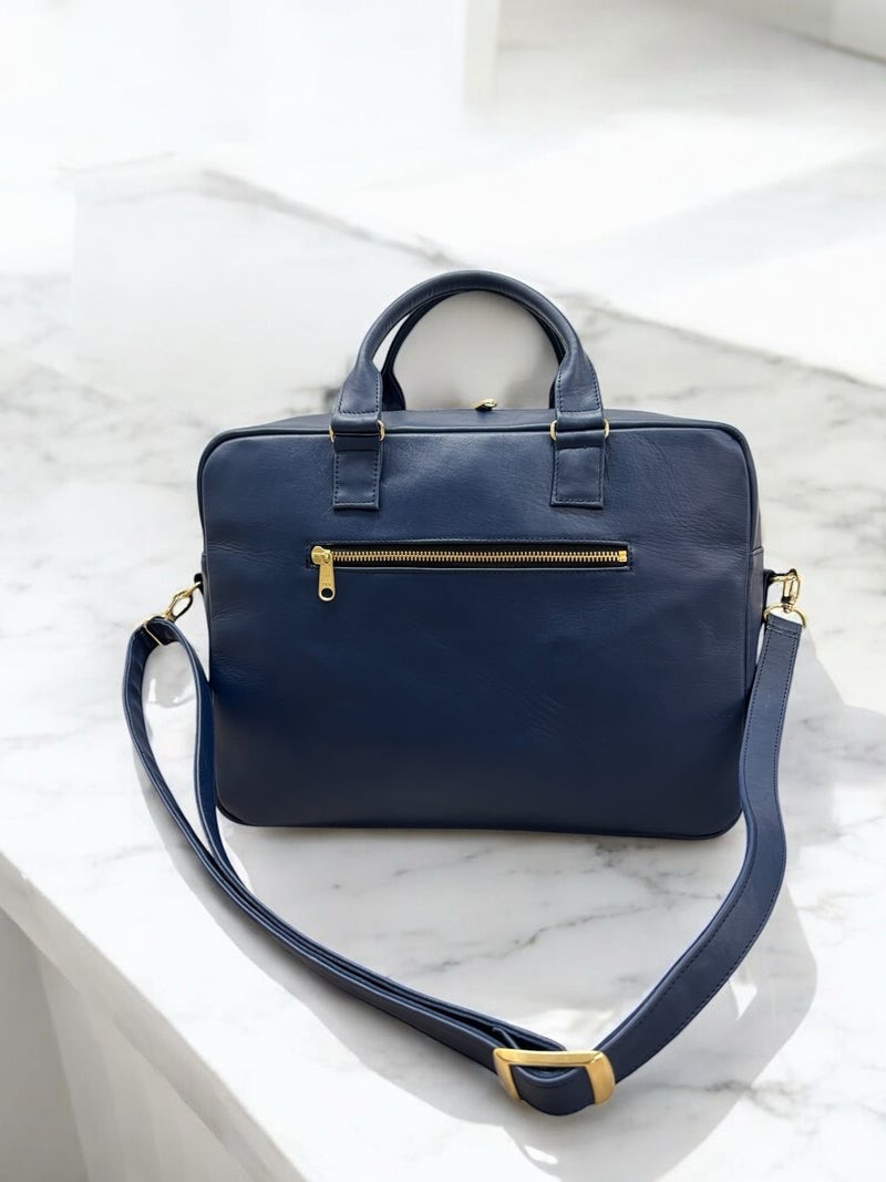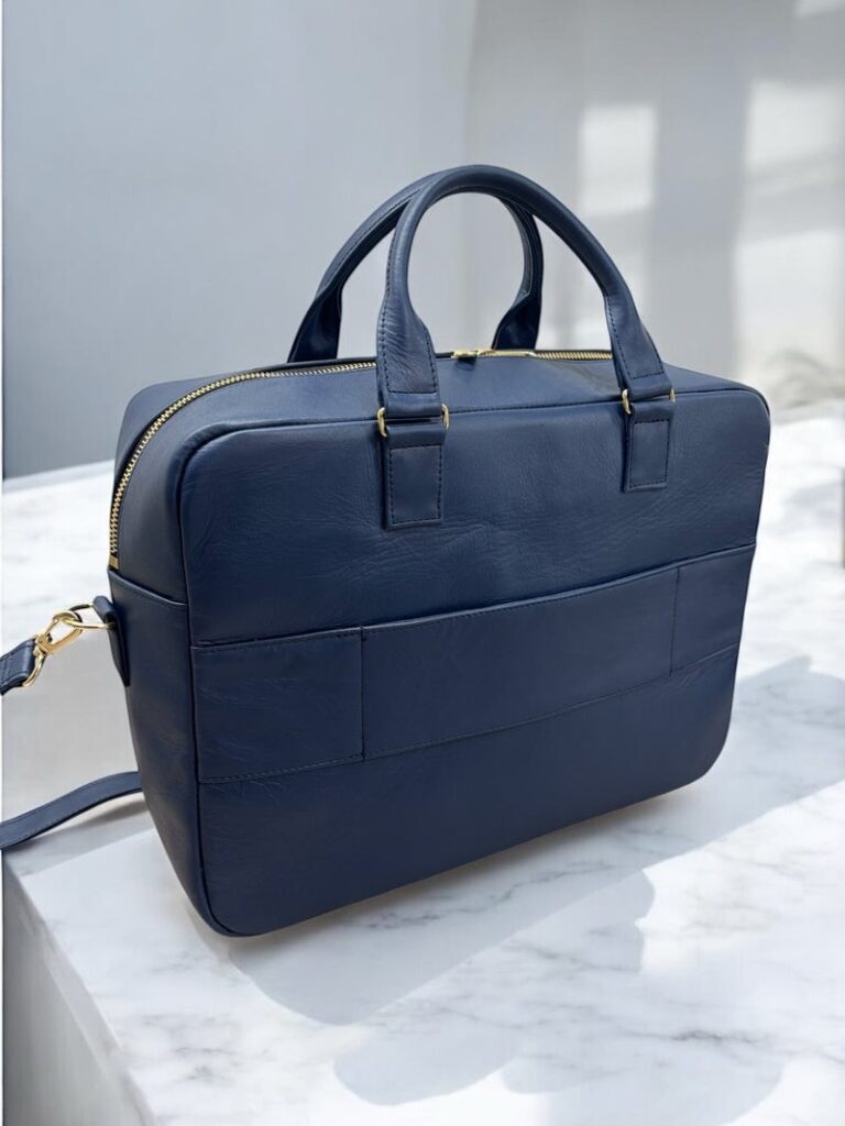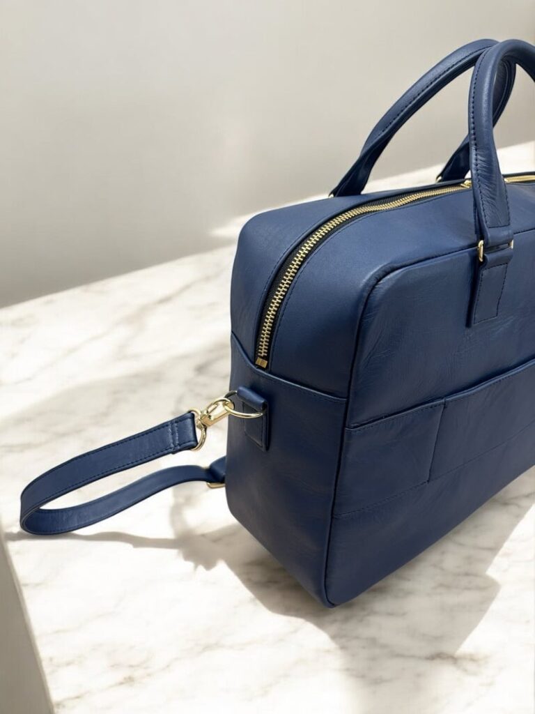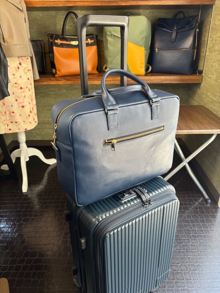 本革ネイビーが上品にお客様のファッションを引き立たせる。
