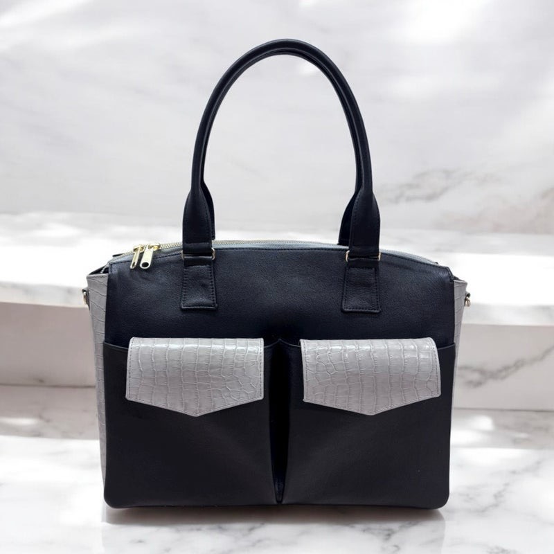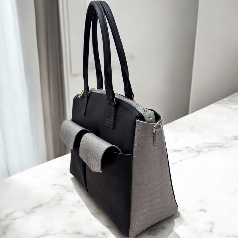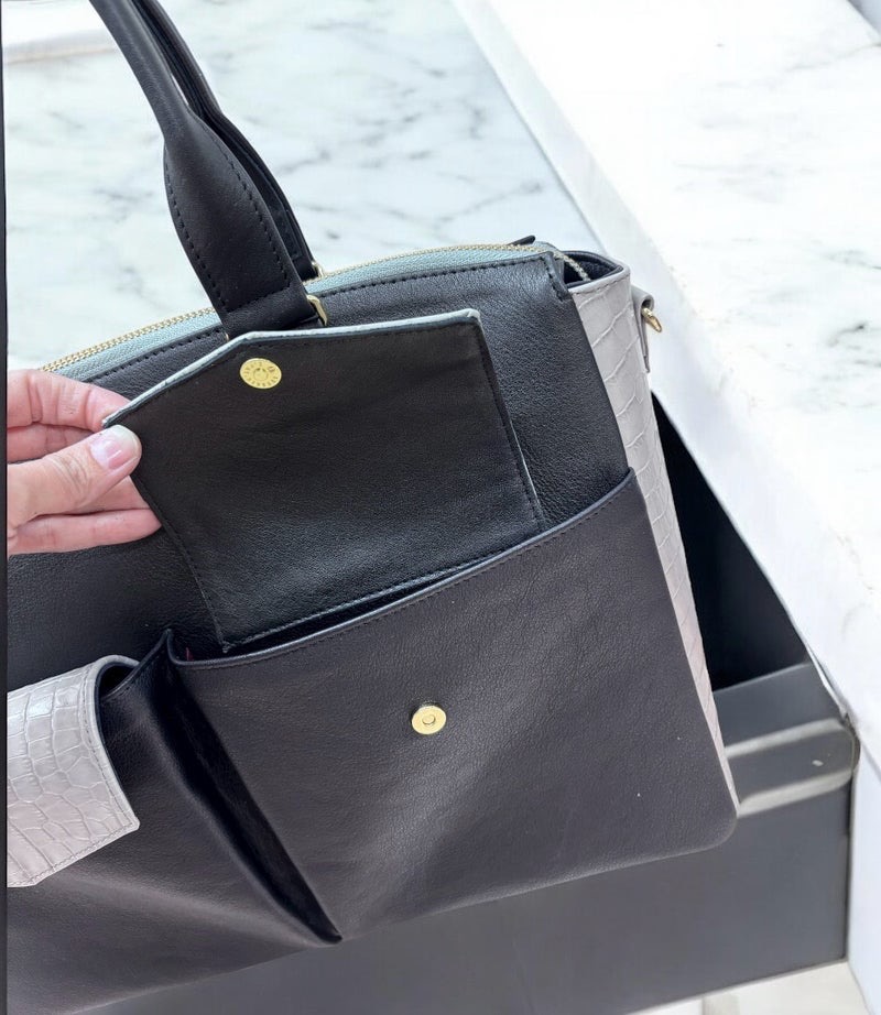 本革ブラックをメインにクロコ型押しグレージュをマチとフラップの表面に。