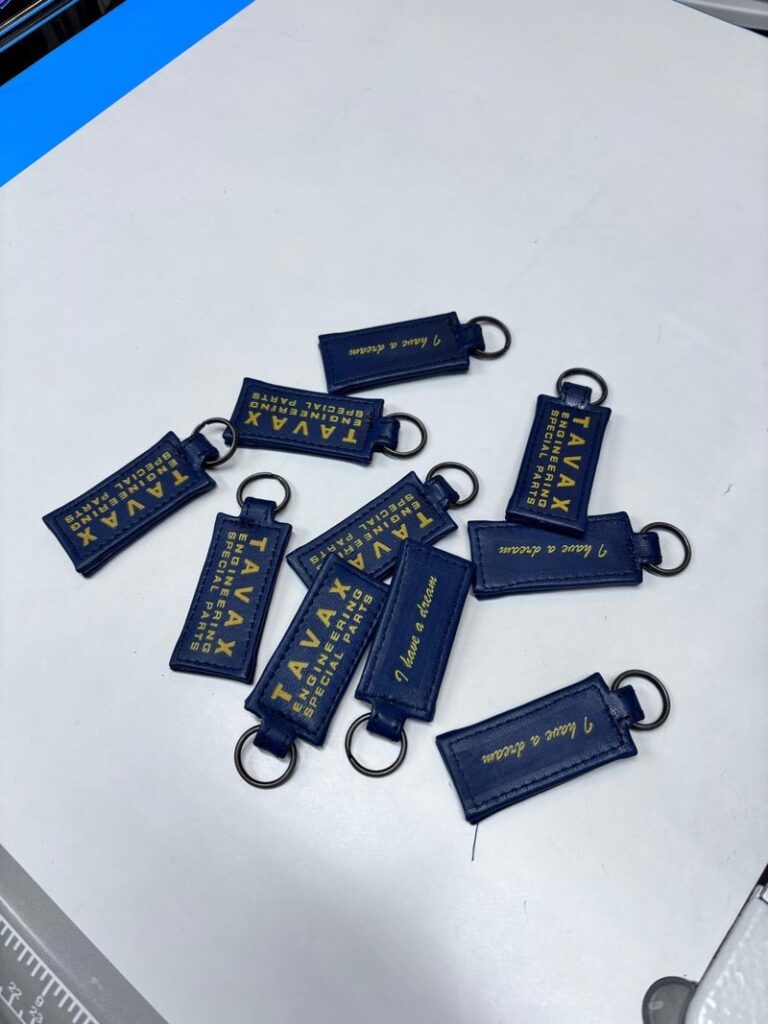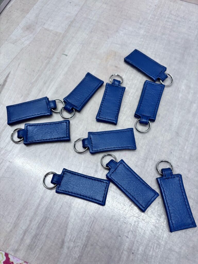 ゴールドとシルバーのロゴを両面につけて本革ネイビーで製作しました。