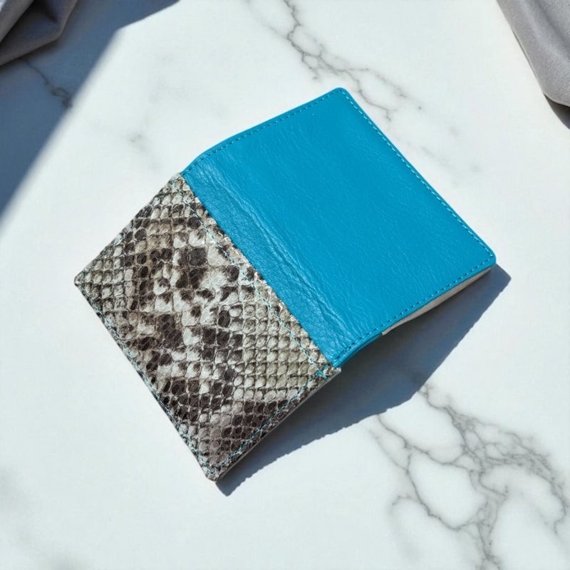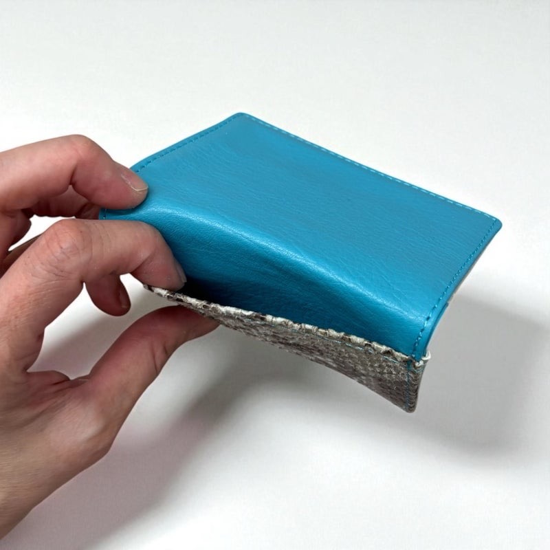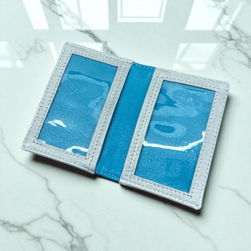 内側は本革スカイブルーをベースにクリアを入れた本革シルバーのポケットのカラーをお選びになりました。