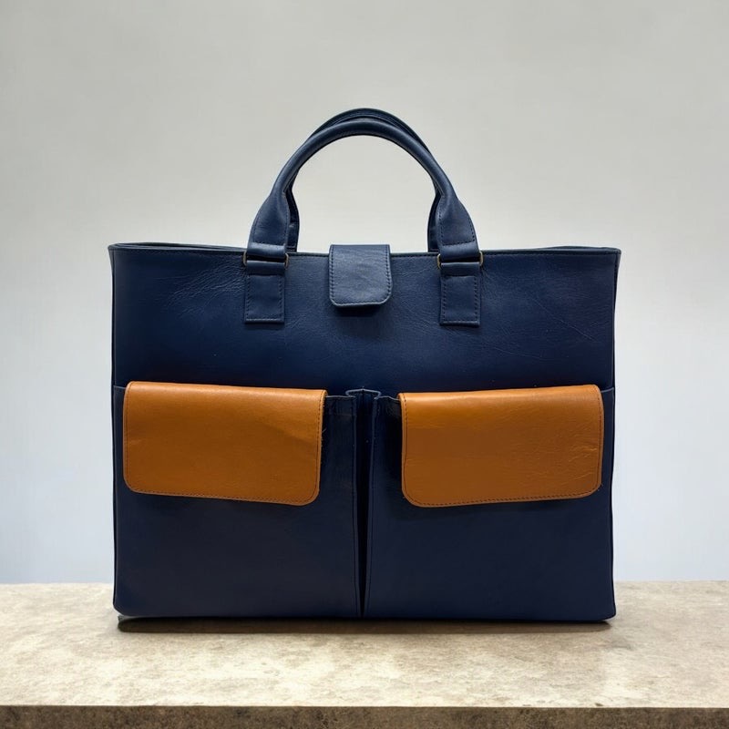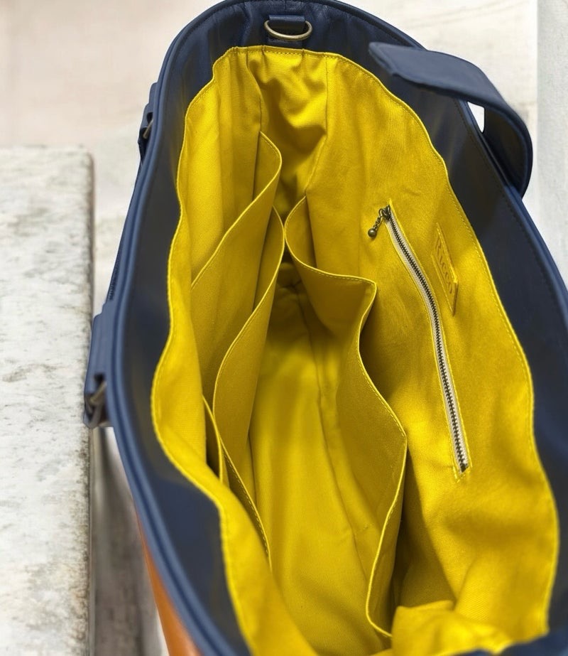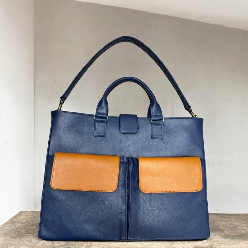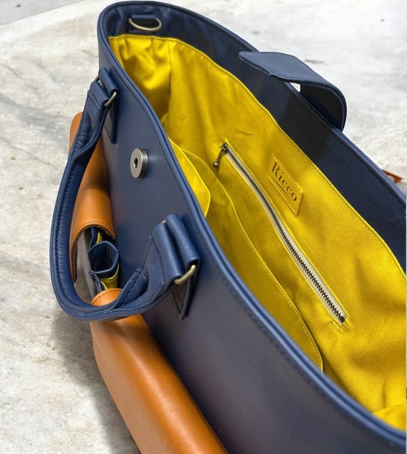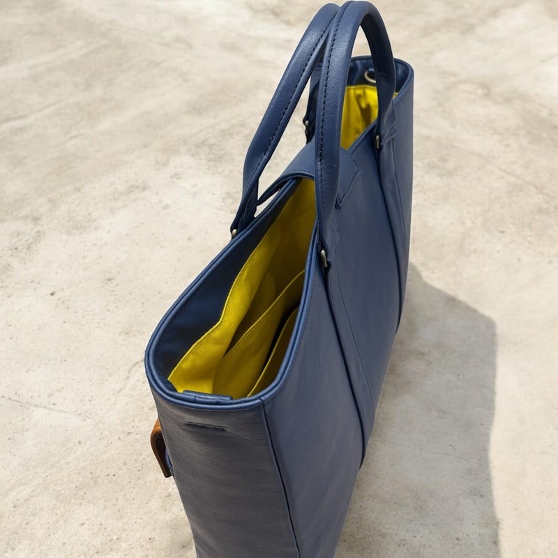 本革ネイビーに差し色のフラップを本革キャメル